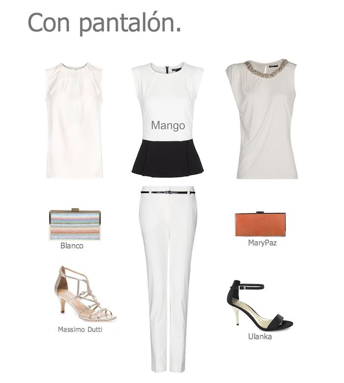 Yo soy muy de vestidos, pero en esta ocasión, me decantaría por el look con pantalón, que me encanta. Apostaría por el pantalón blanco, el péplum bicolor y las sandalias negras. Ya nos contarás por cuál modelo se decidió ella.